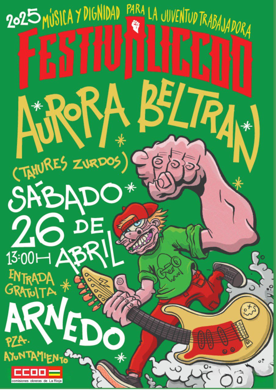 El Festivalicco 2025 Música y dignidad para la juventud trabajadora tendrá su cita también en Arnedo. Contará con la actuación de Aurora Beltrán (Tahures zurdos) y se celebrará el 26 de abril desde las 13.00 horas en la Plaza del Ayuntameinto de Arnedo, con entrada gratuita.