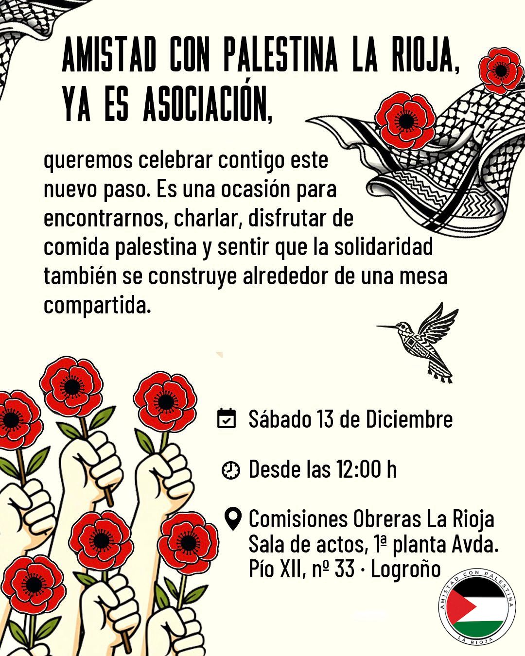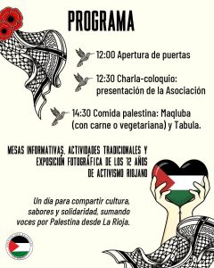 Amistad con Palestina La Rioja ya es asociación y queremos celebrar contigo este nuevo paso. Es una ocasión para encontrarnos, charlar, disfrutar de comida palestina y sentir que la solidaridad también se construye alrededor de una mesa compartida.